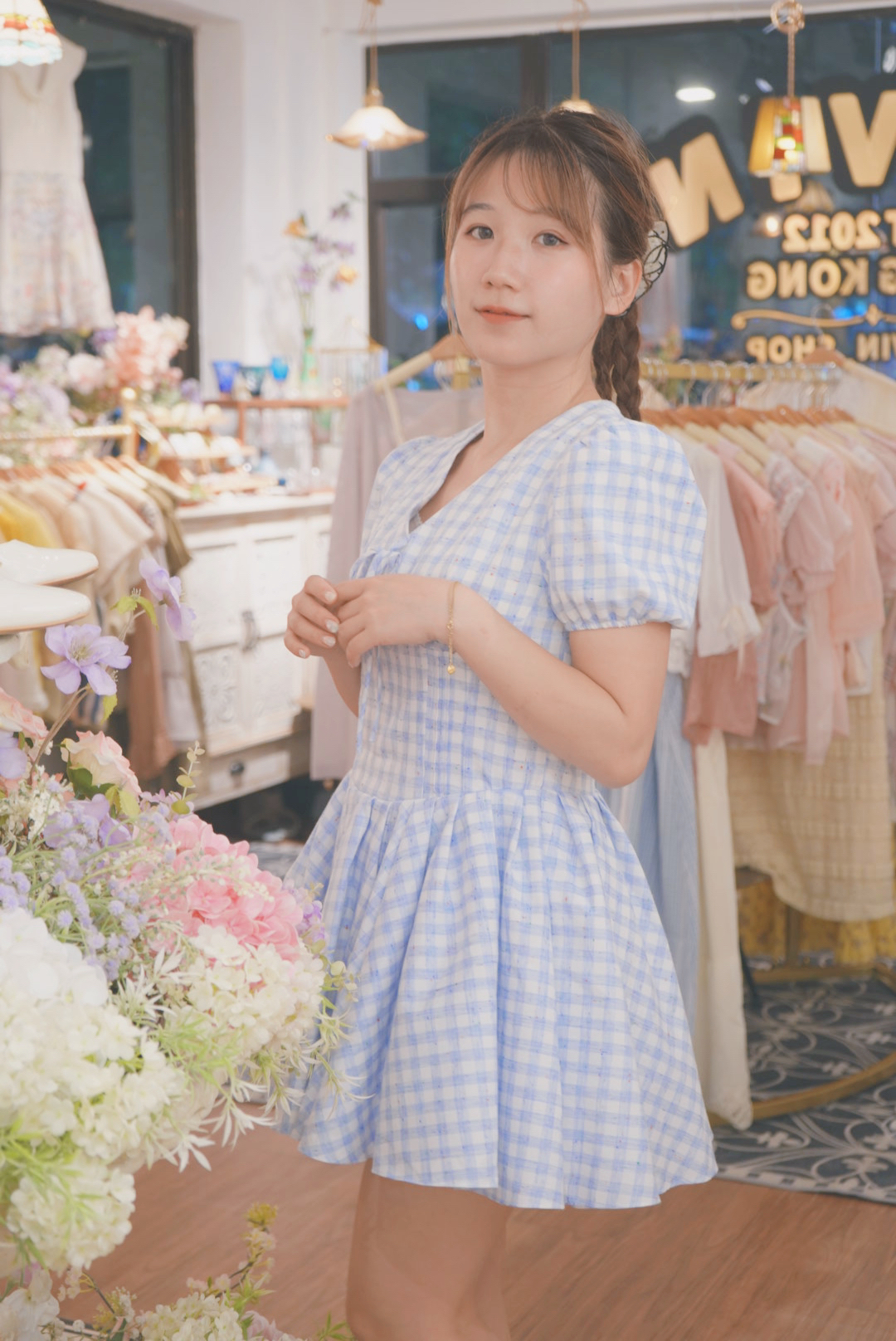 天藍色格仔短款連身裙